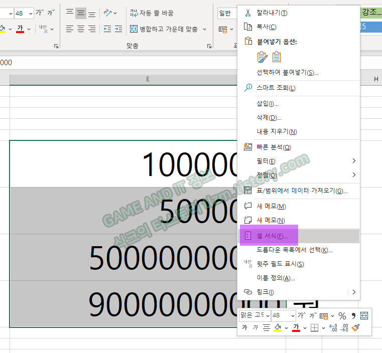 STEP1. 드래그한 상태에서 마우스오른쪽 버튼을 클릭하시고, 셀서식을 눌러주세요.