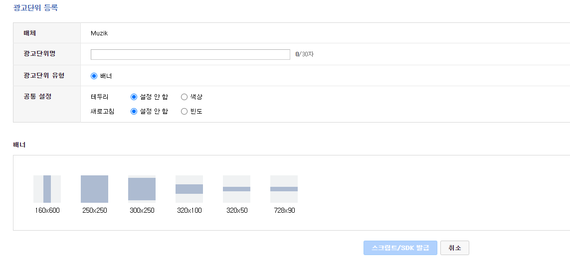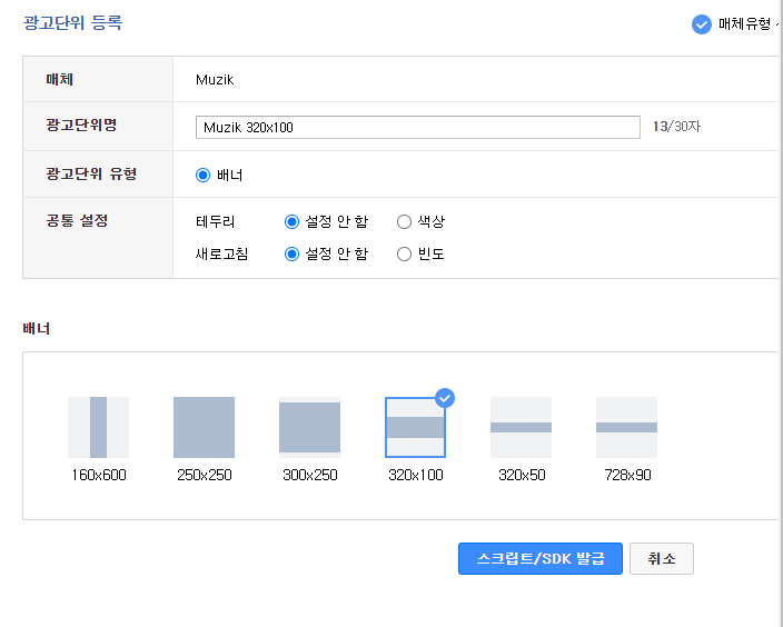 STEP10. 광고단위등록을 누르시면 아래와 같이 화면이 뜹니다. 광고단위명은 본인이 보시기에 편하게 입력하시면 됩니다. 저는 편의상 광고할 블로그명과 광고사이즈를 입력하겠습니다. 하셨다면, 스크립트/SDK 발급을 눌러주세요.