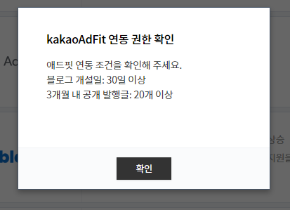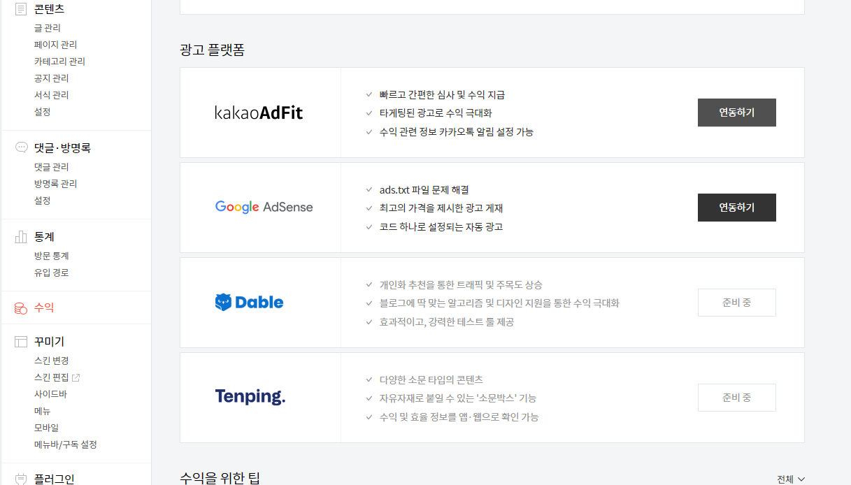 STEP12. 다시 블로그홈으로 수익을 눌러줍니다. kakaoAdFit의 연동하기를 눌러주세요. 저는 눌렀더니, 애드핏 연동조건에 해당하지 않아서 현재는 할 수가 없네요.