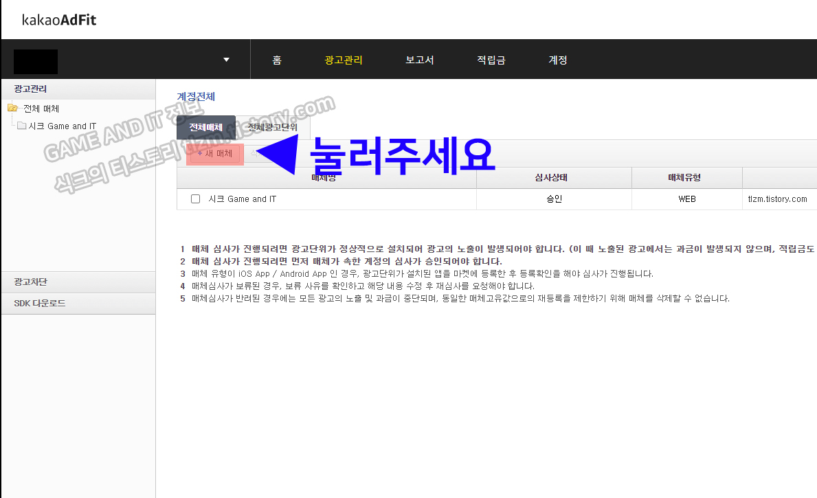 STEP5. 그럼 아래창과 같이 뜨는데, 여기서 매체명과 매체고유값을 입력해야 합니다. 매체명은 본인이 관리하시기에 편하게 하시는데요, 포스팅을 위해 새로 만든 티스토리 블로그에 신청을 해보겠습니다. 물론 자격조건은 하나도 해당하지 않는 블로그 입니다.