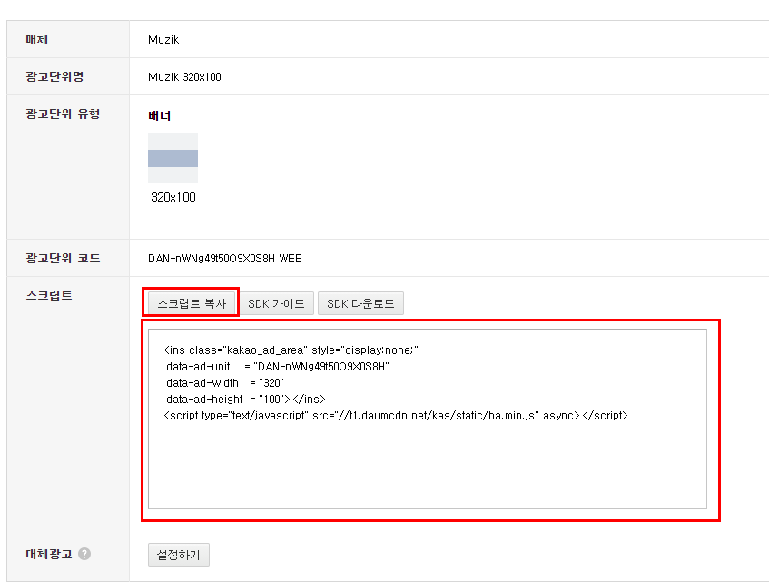 STEP11. 발급을 누르시면 아래와 같이 뜹니다. 스크립트 복사를 눌러주세요.