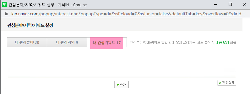 STEP5. 저는 3개를 삭제했는데, 그럼 이렇게 내관심키워드 17 이라고 뜹니다. 원래 20개가 만땅 채웠었습니다.
