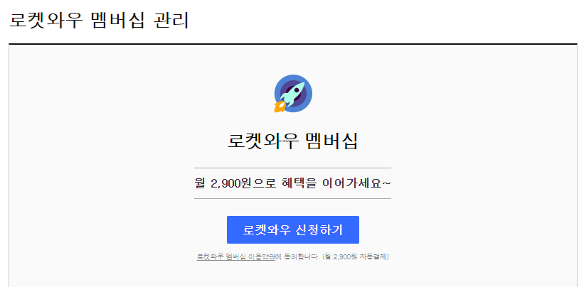 이어서 로켓와우 멤버십 관리라고 뜨면서 로켓와우 신청하기 하시라고 하는데, 해지 했는데 굳이 왜..? 근데 월 2,900원이면 부담이 안되는 금액이기는 합니다. 거기에 쿠팡에서 제공해주는 서비스들이 있기는 하지만, 필요하시다면 잘 알아보시고 계속 사용하셔도 되고 그게 아니면 안쓰셔도 될거 같습니다. 저는 과감히 결정했습니다. 한푼이.. 아쉬워서요