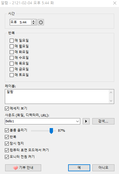 일단 아래좌측이미지와 같이 추가를 눌러주세요. 추가하셨으면, 아래우측이미지와 같이 시간설정하고 반복하실거면, 반복요일 설정해주시고요. 레이블은 음.. 제목이라고 보시면 됩니다. 알람을 설명할 제목을 써주시고요. 사운드는 다 들어보시고 결정하시면 되고요. 볼륨올리기는 최대 100%인데, 볼륨 적당한 크기로 설정하셔서 하시면 됩니다. 컴퓨터 휴면모드에서 켜기도 저는 해놓았는데, 그래야 혹시 잠깐 일어나서 무슨일하다가도 알람울려서 '아 무슨시간이지?' 하고 보고 알게 됩니다.
