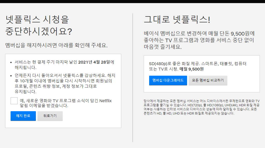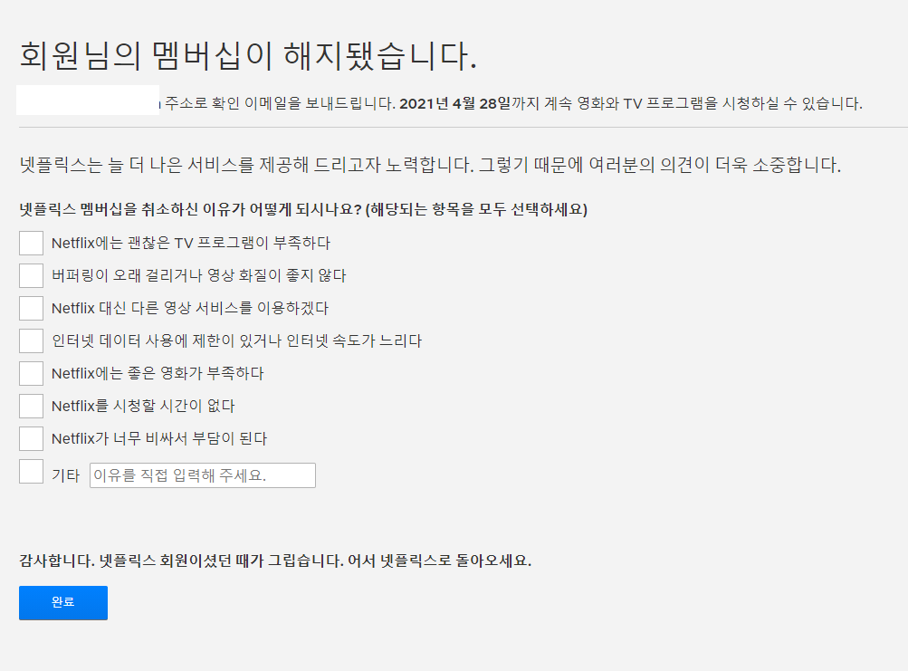 STEP4. 그러면 아래와 같이뜹니다. 완료가 되었습니다. 이러면, 바로 해지가 되었지만, 이번결제까지는 결제가 되고 그다음부터 중지 입니다. 고로, 그전까지는 넷플릭스 신청을 계속 할 수 있습니다. 끝나면 당연히 안되구요!