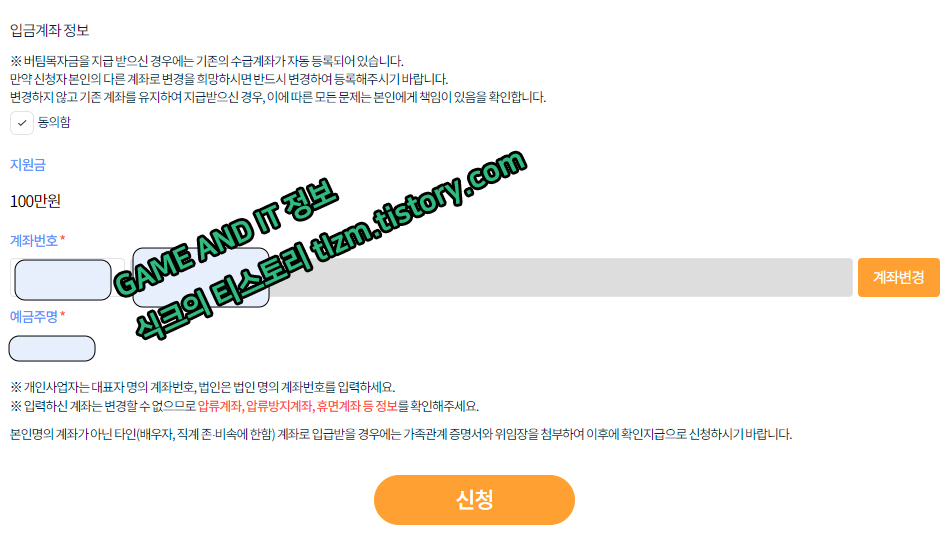 STEP3. 계좌번호와 예금주명도 자동으로 이미 입력되어 있습니다. 신청버튼만 눌러주시면 됩니다.