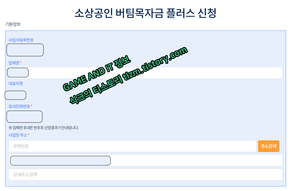 STEP2. 이어서 채워야 하는 항목을 채워주세요. 사업자등록번호 대표자명 휴대전화번호는 자동으로 입력되어 있어서, 업체명과 사업장주소만 입력해주시면 됩니다.