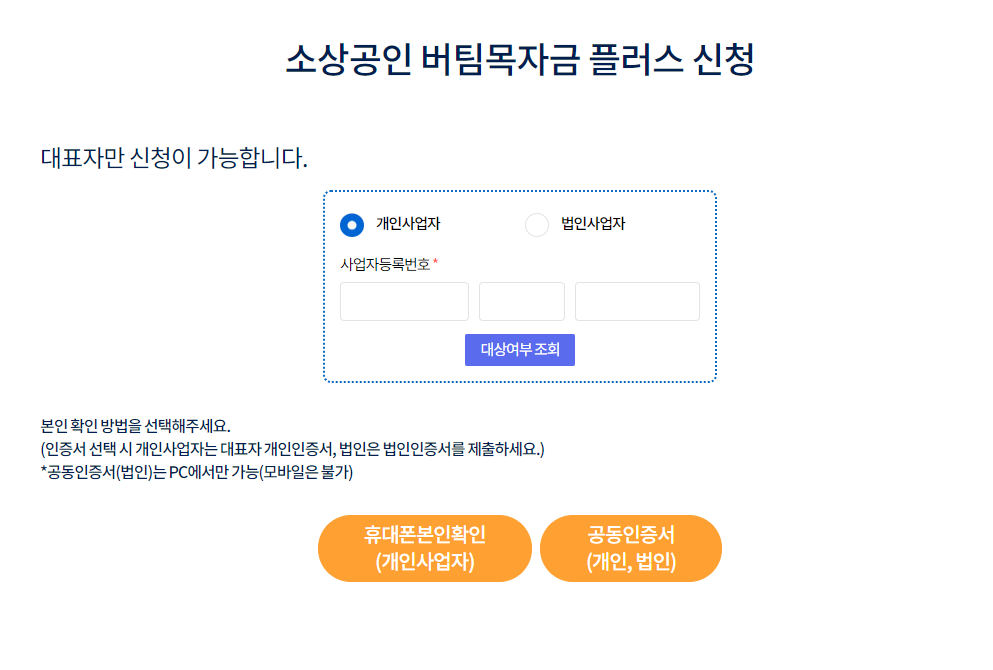 STEP1. 먼저 개인인지 법인인지 사업자 구분하시고, 사업자등록번호를 입력해주세요. 그다음은 대상여부 조회, 이어서 휴대폰본인확인을 하시면 됩니다. 이거는 약간의 팁인데, 자꾸 오류가 나서요, QR코드 인증으로 하시면 오류횟수 3회 초과하기전에, 인증완료 하실 수 있습니다.